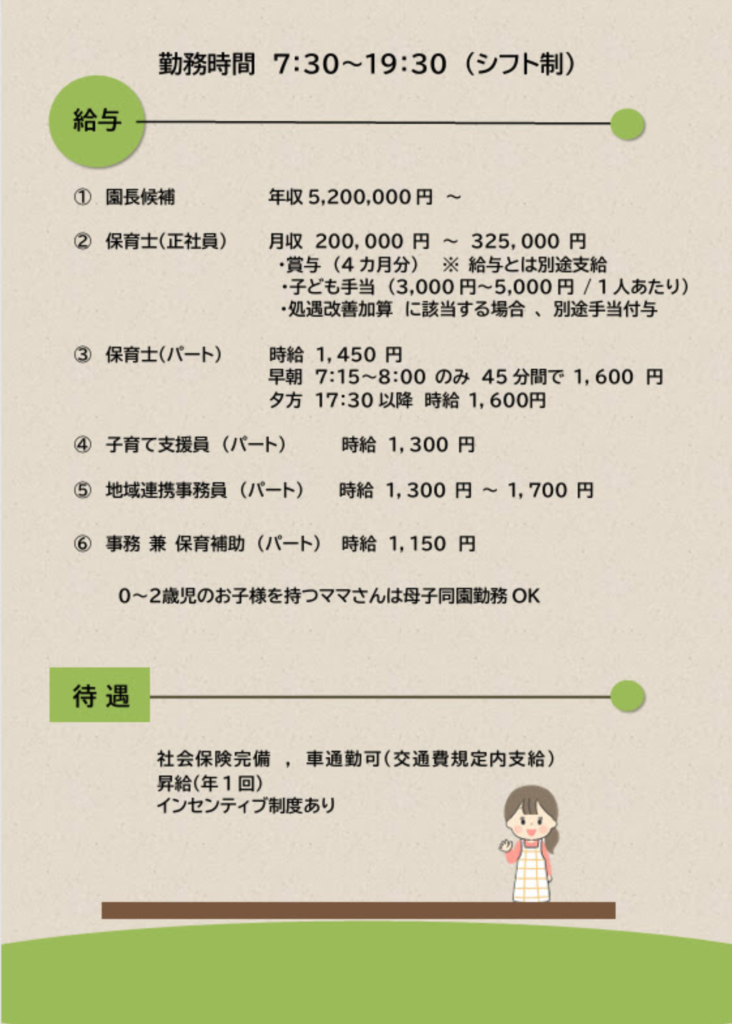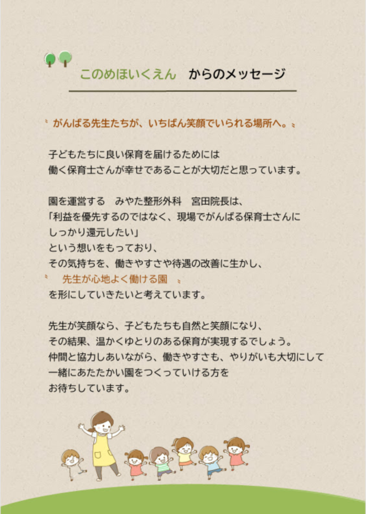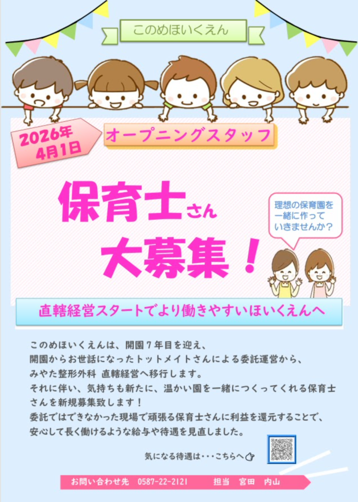 ✨保育士募集のおしらせ✨ お知らせ 2025.12.05 Fri このめほいくえん このめほいくえんは、子どもたちだけでなく、ここで働く先生たちの毎日も大切にしたいと考えています。 温かい職場は自然と温かい保育につながります。 そんな園を一緒に作っていける方をお待ちしています。 ご質問等はお気軽にメール、またはお電話にてお問い合わせください。 SHARE ON シェア シェア ブログ記事一覧に戻る 令和8年度 入園説明会・見学会のお知らせ 園児募集状況について